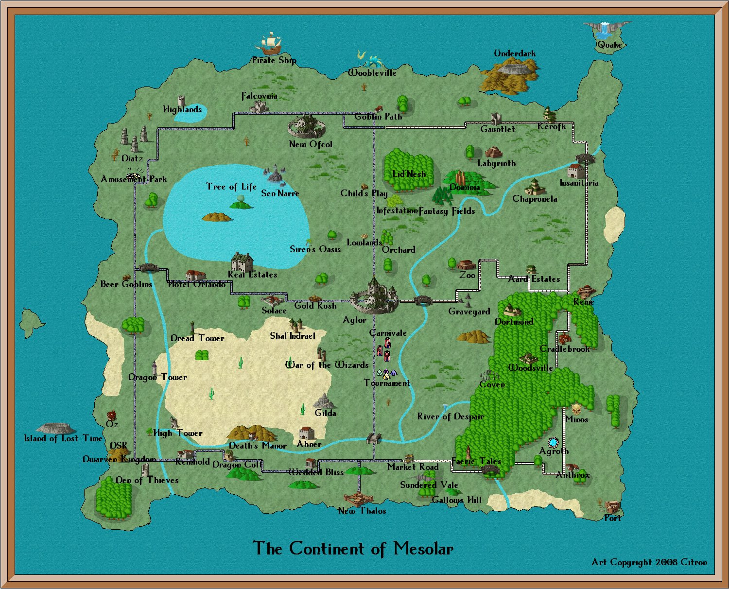 Location: Home / Game World The Aardwolf adventure is set in Andolor, meaning 'greatest world' in ancient tongue. Andolor orbits a single sun, but unlike other worlds, does not rotate. Andolor's three moons and several large planets between Andolor and its Sun give the impression of rapidly changing day and night. There are no seasons or changes in climate. Tropical areas stay tropical,the frozen land of Gelidus remains frozen. In terms of geography, much of the vast Oceans of Andolor remains unexplored. Many islands exist within these oceans, guarding many mysteries. While Andolor is not completely circular, head in any direction long enough and you will arrive very close to where you started, assuming you survive the journey. Four main continents have been discovered so far on Andolor. Mesolar The Continent of Mesolar is the central hub of civilization on Andolar. Great cities and small towns have formed alliances and treaties, established extensive road systems, and negotiated trade routes and diplomatic ties. As a result, Mesolar is the safest place for the average citizen to live, and therefore the most heavily populated by the "civilized" races. Click each thumbnail for the detailed map. Abend To the west of Mesolar, past the 'Forbidden Waters', or Banalog Ocean, lies the dark continent of Abend. Constantly in twilight, much evil is rumored to exist here. Few have returned from adventures to the West, so only lore and legend remain. The mountains and rocky terrain are fabled to be infested with every vile sort of creature, and adventurers who seek their treasure there are advised to walk warily. Alagh To the east of Mesolar, across the Aphasian ocean is the Blood continent of Alagh. Alagh means "battle glory" in ancient tongue, an aptly named continent ravaged by centuries old battles. Alagh is also home to the great Eastern Desert and tropical jungles to the South, and the waters of the Lem-Dagor ("into battle") to the west. The hills and barren plains of this war-ripped land are stained in the blood of fallen innocents, and the trees themselves bloom with blood-red foliage in memory of the blood spilled here. Gelidus To the North of Mesolar is the frozen continent of Gelidus. Contained on the side of Andolor permanently away from the sun, the continent is covered in snow and ice formed from the frozen E'a Siirima, Elvish for 'into liquid'. Across the coldest point of Gelidus is a vast and icy mountain range, where ancient glaciers and vast forests of ice stand their ancient watch. Very little civilization resides in this frozen wasteland, but ruined fortresses and retreats of the monsters who love cold await the eager hero who ventures here. Oceans The waters of the Iridian, or iridescent sea, lay to the south of Mesolar. Various societies have started to form within the waters and on the few islands that have formed over the ages. Rumored are civilizations which have even sprung up under the ocean waters themselves. The Iridian Sea abuts against a vast, uncharted ocean, in which islands can occasionally be found by the lost traveller. There are even fables and legends, scorned by learned navigators and scholars, that another continent resides within these uncharted waters...no trace of this land has been found, at least by any who have returned to tell the tale. Vidblain There is rumor of a 5th continent. Whispers about Vidblain, the "ever dark". The author cannot verify the truth or location at this time.... | |||